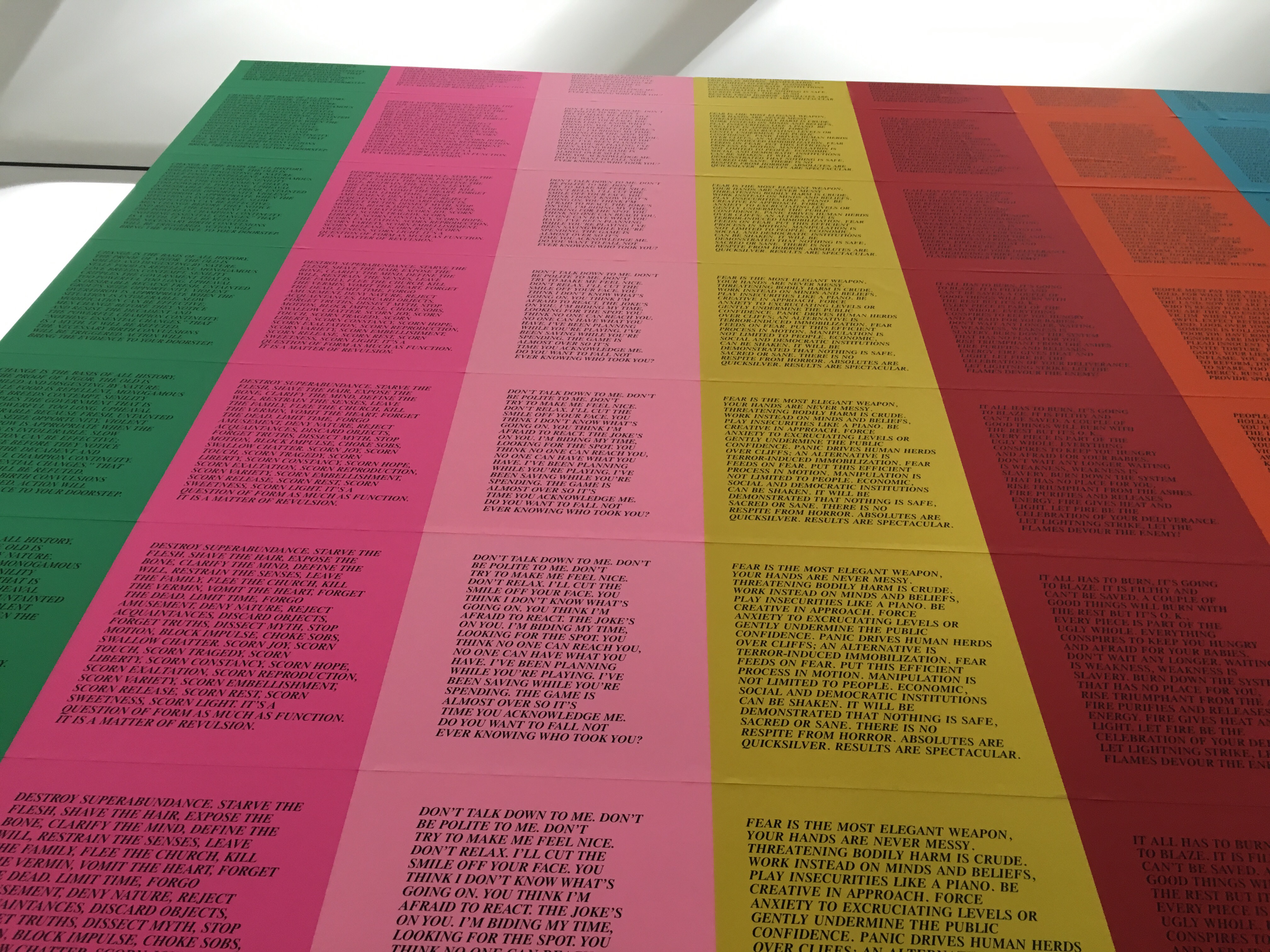 - Jenny Holzer’s “Inflammatory Essays.” Installed on a back wall that can be easily overlooked, the wall also can be viewed as a hidden haven in the museum. There is enough space between the wall and the art that I keep finding myself gazing at it in a similar manner as one would find themselves if ever standing at the Wailing Wall. It’s a piece for communing, about feminism and society and the violent, paradoxical world we inhabit. But it’s funny and always eloquent too. Like many of my favorite art pieces, it’s almost impossible to process this piece in 1 visit. I’ve seen various incarnations of it over the past decade and the more I see it, the more I want to return and watch others thrust into the colorful rage of text and ideas.