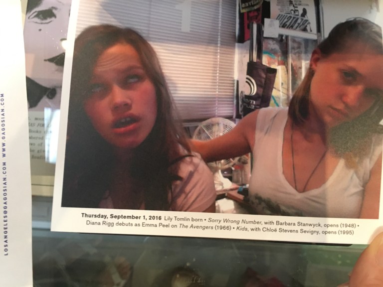 One page of Kim Gordon’s 558 day calendar at Gagosian where her daughter and friends make ridiculous female record store “reaction shots” to customers. The page highlighted would be my birthday page this year.