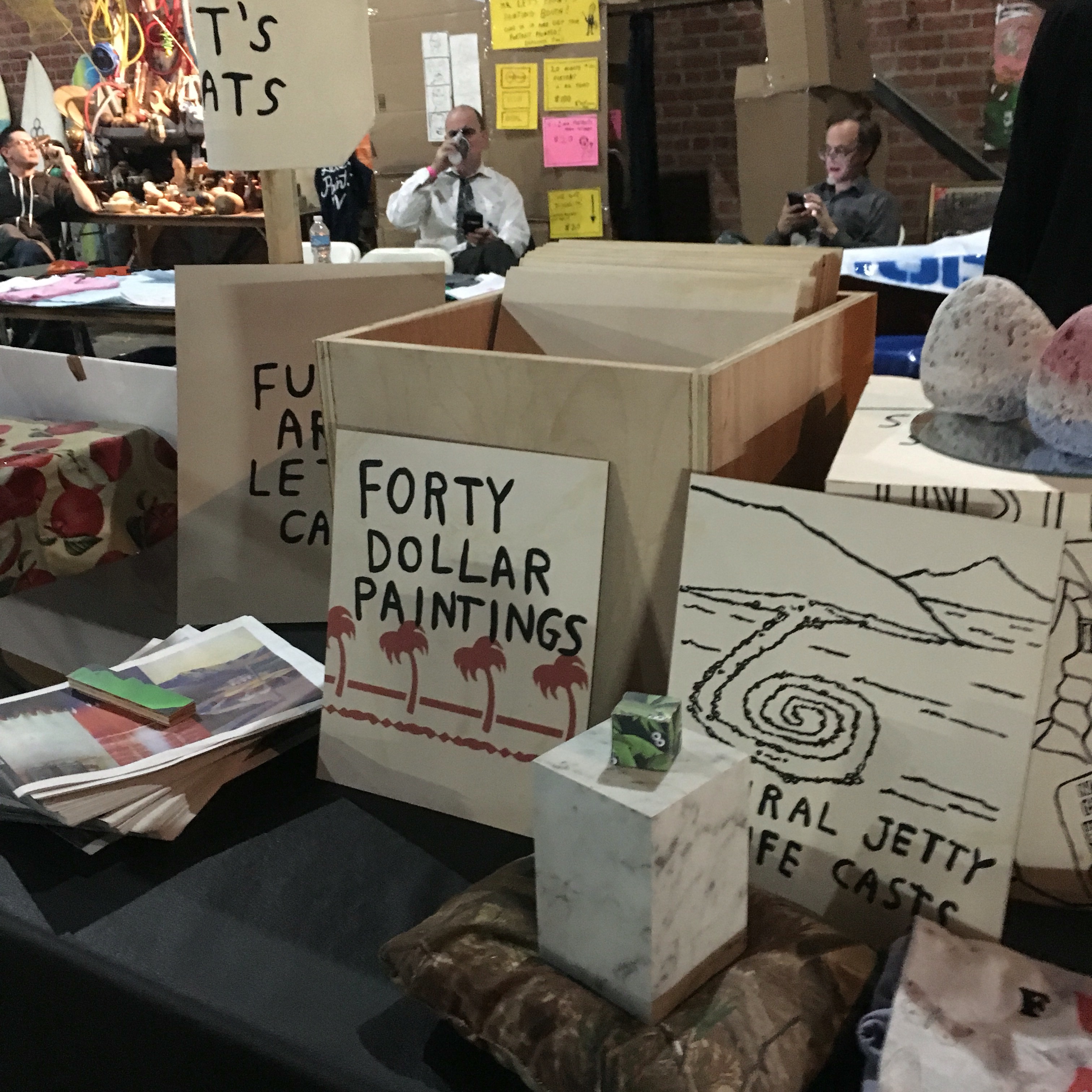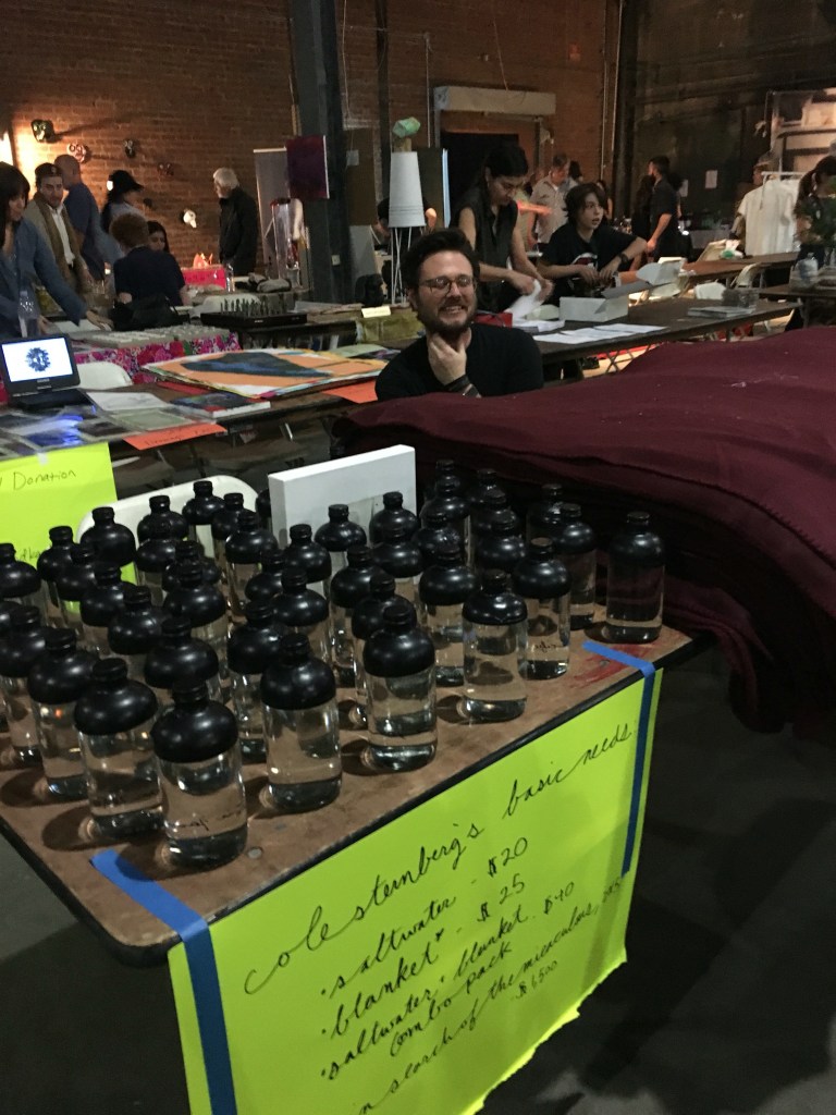 Cole Sternberg’s table had an absurdist dystopian vibe to it – where he displayed saltwater, blankets and one piece of art.