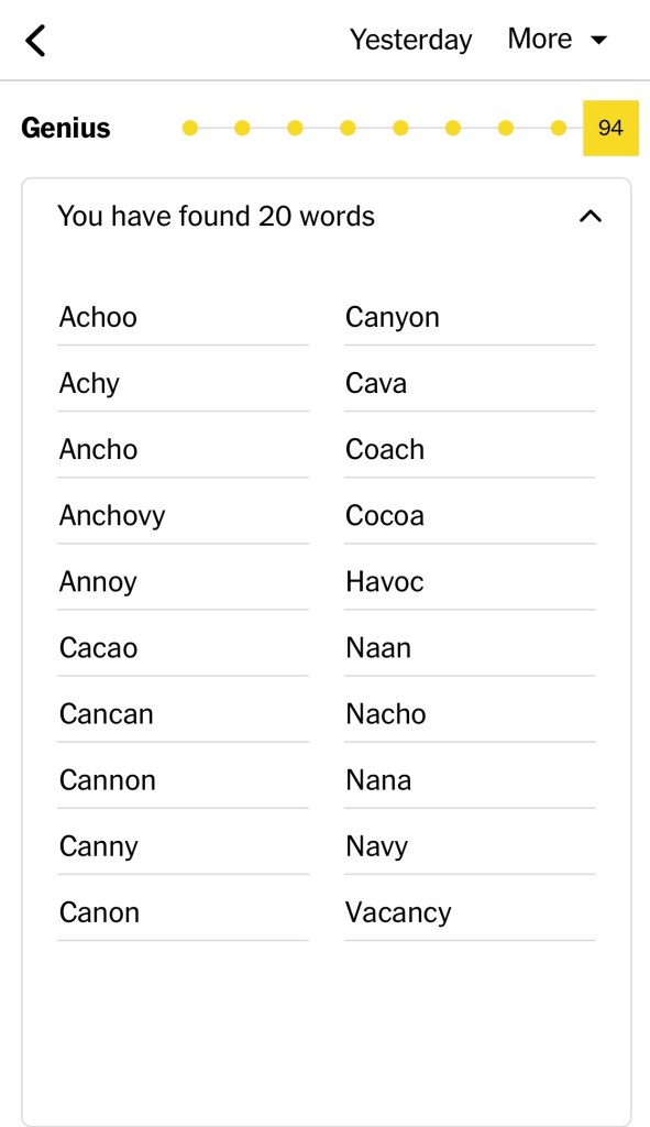 Nana was achy. Her eyes darkened blue into a shade of navy when she felt this way. She still lived alone in the canyon where no one could hear her achoo. The house next door possessed a crumbling vacancy sign which she found comforting. One less leaf blower. No one needed to watch as she crafted culinary concoctions that were nothing short of eclectic based on pantry necessity. She took joy in making a version of nachos with naan, sprinkling cacao atop. She liked to sip cava imagining new dishes. “The culinary canon of Nana in the canyon,” her granddaughter Coco liked to say as they sipped cocoa made spicy with chopped ancho chile. Coco liked to hear stories about Nana’s youth when she attempted cancan dancing. Nana was always coaching Coco on new moves from her recliner. “What was it like after the war?” Coco sometimes liked to ask. Nana closed her eyes, imagining dance sequences with costumes, and cannons. Total havoc. Except she often couldn’t remember what really happened. Was that canny or uncanny? “Everything smelled like anchovy,” Nana remembered.