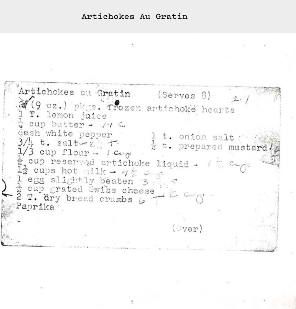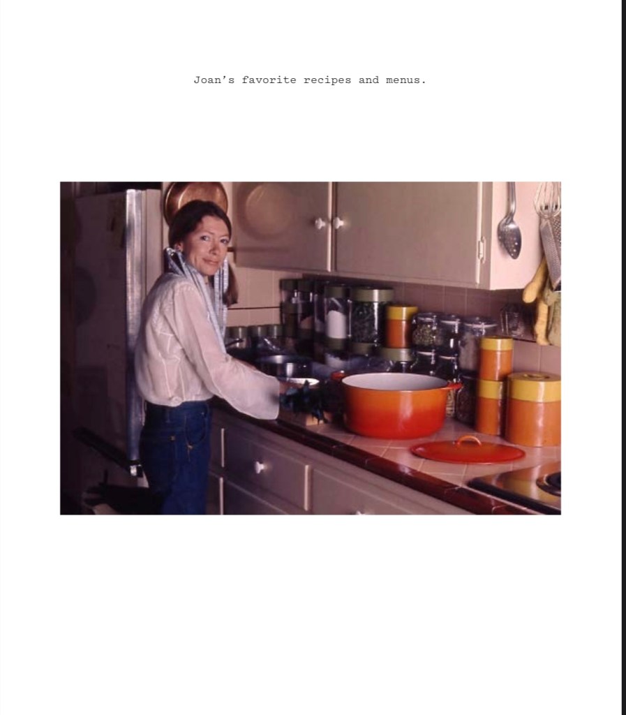 Since I wrote my first piece on Didion, friends I never knew liked her have called, texted or emailed sharing their own Didion worship. I’ve been given and then passed along her collaged cookbook, a scrapbook of typed dinner guests and menus, organized by season, alongside scattered recipes like Orso’s Roasted Chicken with Black Olives and Sausage for fall, to a typewritten faded Artichoke au Gratin for 6 in winter. Each recipe is in a different format, gathered over decades from a variety of sources. I’ve skimmed through the entire pdf multiple times, intrigued by this digital artifact in a deeper way than her museum show at the Hammer or Didion’s own auction. The marks on the pages draw me into the writer’s humanity to connect over ideas around food, something that resonates deeper than owning any physical object will ever entail.