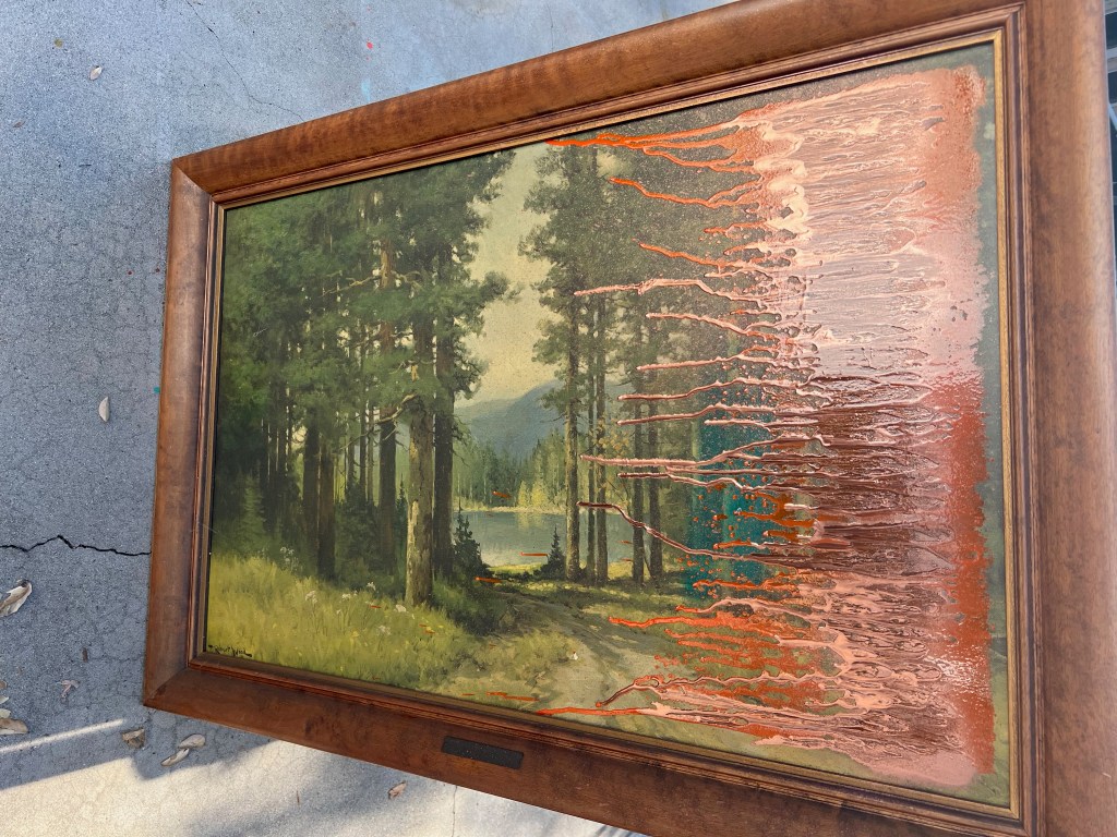Today is December 1, 2024. Today is World AIDS Day. It is 4 years to day since I first took a group through a daily painting practice. It is 3 years to the day that I awoke at dawn in Miami and discovered the Sho Shibuya Today show at the beach. It is 2 years to day since I shared it with others at the entrance of Untitled Miami during one of the most joyous days of life. It is a year to the day that I painted in blue and green spray paint in my garden on the Friday after Thanksgiving and awaited going to Art Basel Miami at dawn the next day. Today is December 1st again. I am in Los Angeles. I awoke and cleaned my studio. I removed a large painting that had been gathering dust in the corner for almost 10 years, a framed nature piece that had been part of the as is sale of our house and took it outside. I let it sit outside for a few minutes, then walked back into my studio and returned with 3 cans of spray paint. I proceeded to spray paint over it. The act felt liberating. It took me almost an hour and in between alternating colors, I sat on a plastic folding chair in my backyard, pausing in pleasure. I thought about finding thrift store paintings and making groups of people paint over them. It seemed like an appropriate thought to have on this day, a small, new idea that may or may not occur. Then as the paint dripped down the canvas to make its own marks, I went back inside the house and read more, “Didion & Babitz.”
