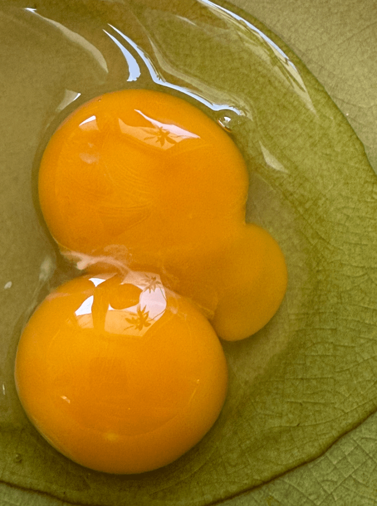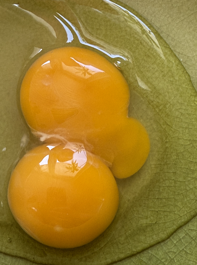 Lately I have been wondering about the scale of futility. This is in relation to creation in an age of AI. I contemplate how many other makers think that the time to share their ideas about culture is wasted if their ideas are inevitably going to be used as training for next gen LLMs, that will spew out iterations of thoughts at a pace exponentially unfathomable. And if they were better suited to spend their valuable minutes on earth just living. I often think about these things in the kitchen, or making food, or walking in circles to get exercise when I am home because daily life in Los Angeles is still so sedentary and isolating. And then something just occurs to remind me that as animals we have a bit more agency than I am giving ourselves credit for. Today this happened when my friend Carol was making us breakfast. She cracked an egg and it had a double yolk. We marveled at this miracle of biology and she remarked that it was good luck.